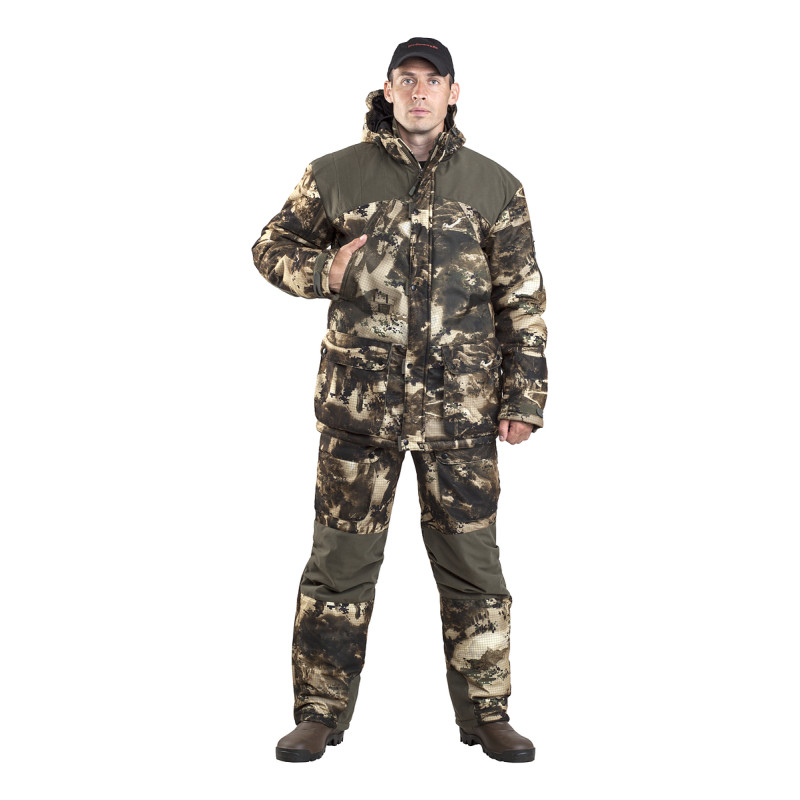 Костюм разработан специально для зимнего сезона,состоит из полукомбинезона, жилета и куртки. Основной материал костюма — стойкая к истиранию мембранная ворсовая ткань с показателями 7000/ 7000 (водостойкость/паропроницаемость). В качестве утеплителя используется современный синтетический материал. Утеплённые нагрудные карманы на куртке для тепла рук, большие объёмные карманы для хранения необходимых аксессуаров. По линии плеча настрочена спецлента с латексом, для удобства носки ящика или ружья. Капюшон с регулировкой объема в двух направлениях. Отстёгивающийся жилет с накладными карманами из специальной многослойной ворсовой мембраны. Полукомбинезон с высокой облегченной спинкой, в области колена карман для изолоновой вставки. Костюм разработан для активного отдыха на природе в зимний период.